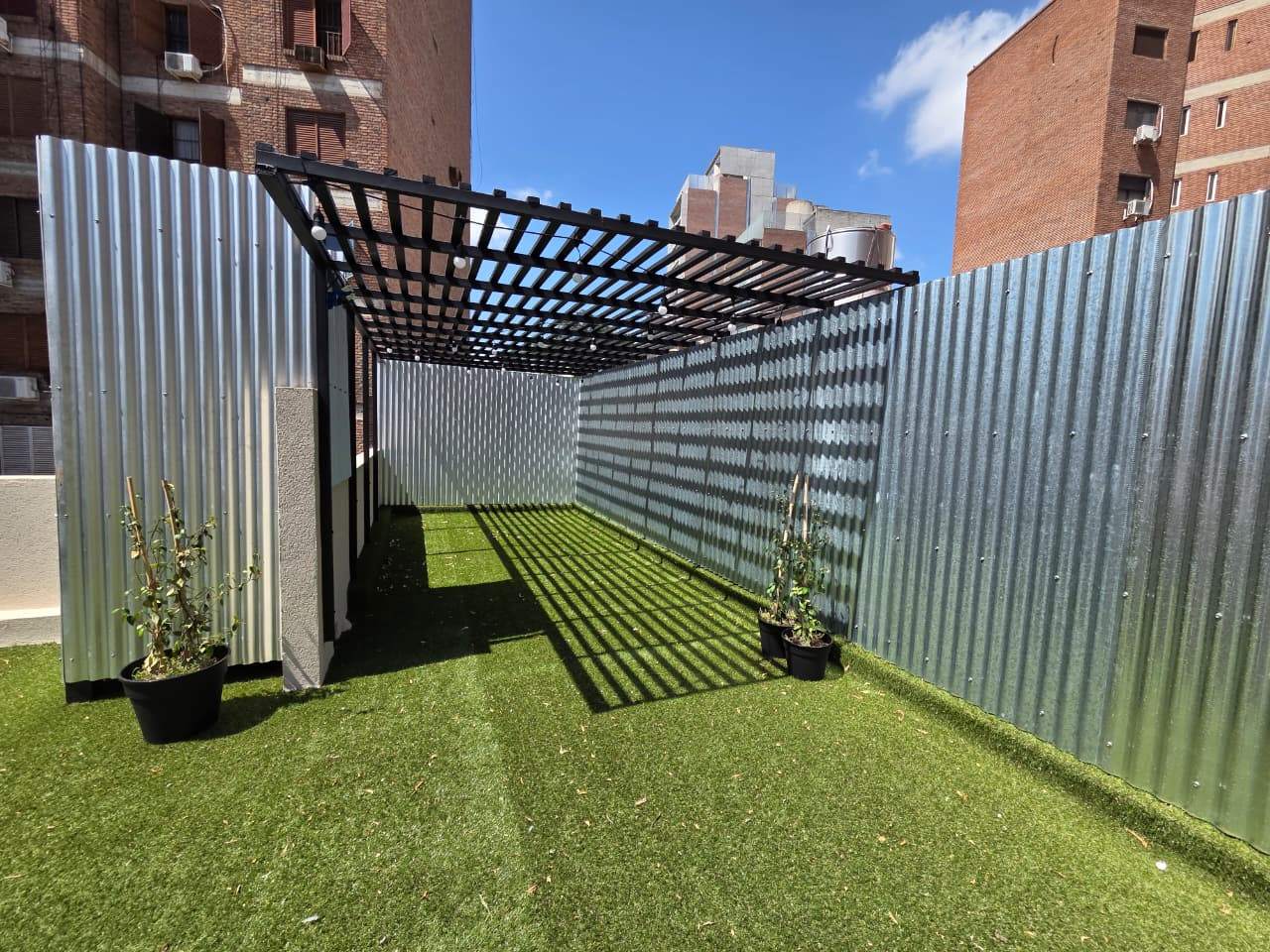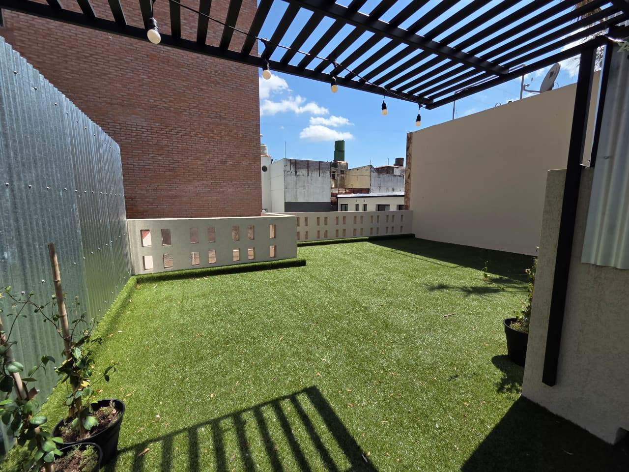 Patio seco con lavadero, parillero y escalera que accede a una terraza exclusiva con cesped sintético, pérgola tipo quincho.